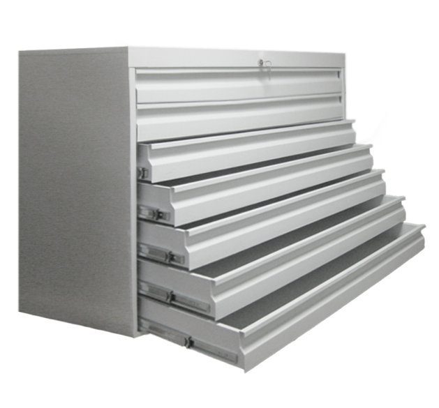 Габаритные размеры: 900х1000х700 мм. Картотека, 7 выдвижных ящиков. Общий замок. Покрыта полимером RAL 7035 светло-серого цвета. Формат документов - А-1.