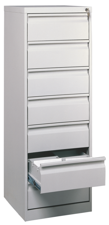 Габаритные размеры: 1375х525х535 мм. Картотека, 7 выдвижных ящиков. Общий замок. Покрыта полимером RAL 7035 светло-серого цвета. Формат А-6, СD диски.