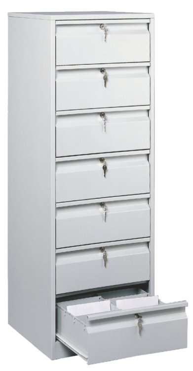Габаритные размеры: 1375х525х535 мм. Картотека, 7 выдвижных ящиков. Имеют комплектацию для хранения формата А6!!! Каждый ящик закрывается на отдельный замок. Покрыта полимером RAL 7035 светло-серого цвета
