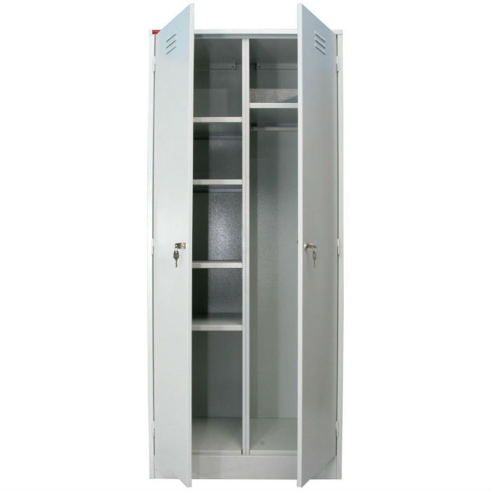 Габаритные размеры, 1860х600х500 мм. В одном отделении полка и перекладина для вешалок, вдругом четыре полки для хранения бытовой химии. Покрыта полимером RAL 7035 светло-серого цвета.