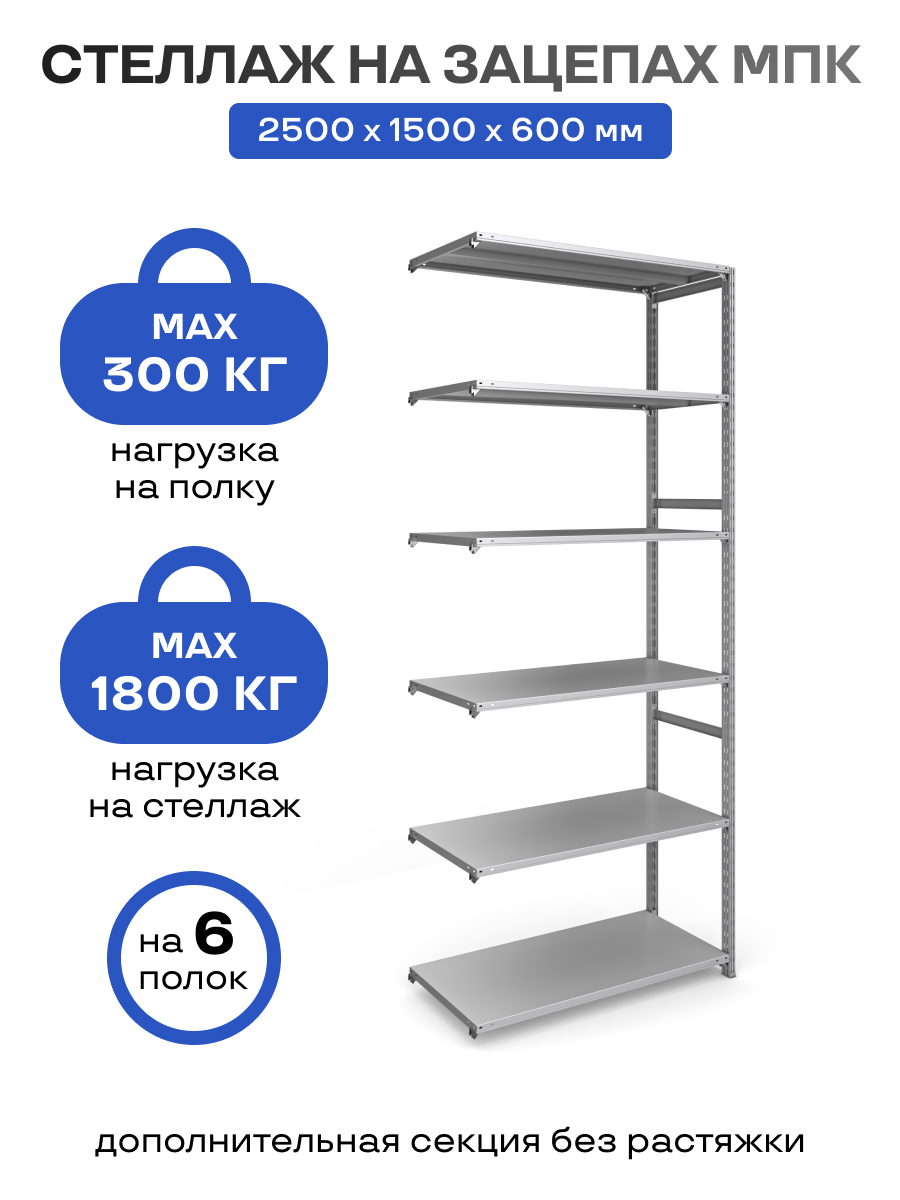 Стеллаж на зацепах МПК (2500х1500х600)/6, нагр.300кг (дополнительная секция с растяжкой)