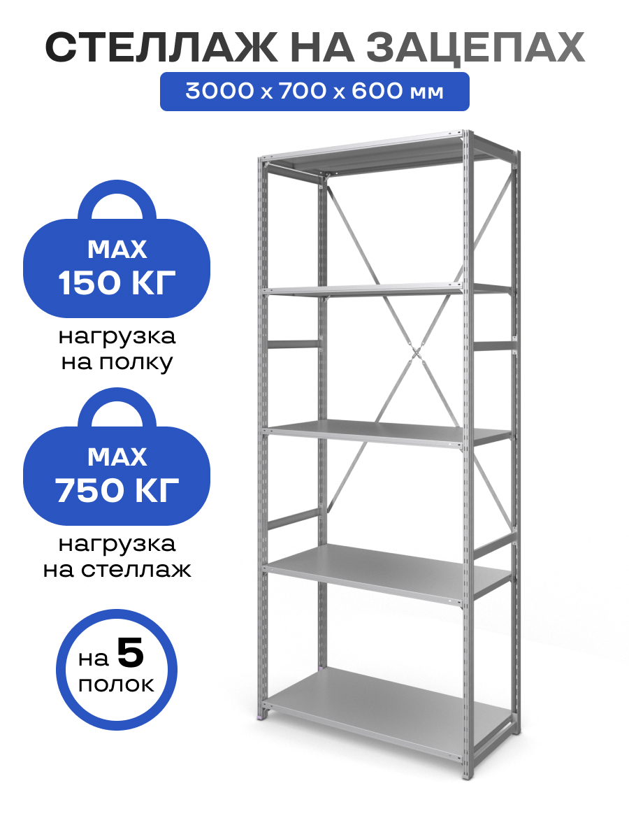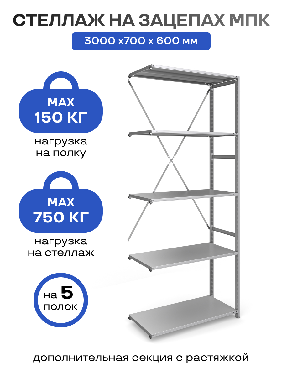 Стеллаж на зацепах МПК (3000х700х600)/5, нагр.150кг (дополнительная секция без растяжки)