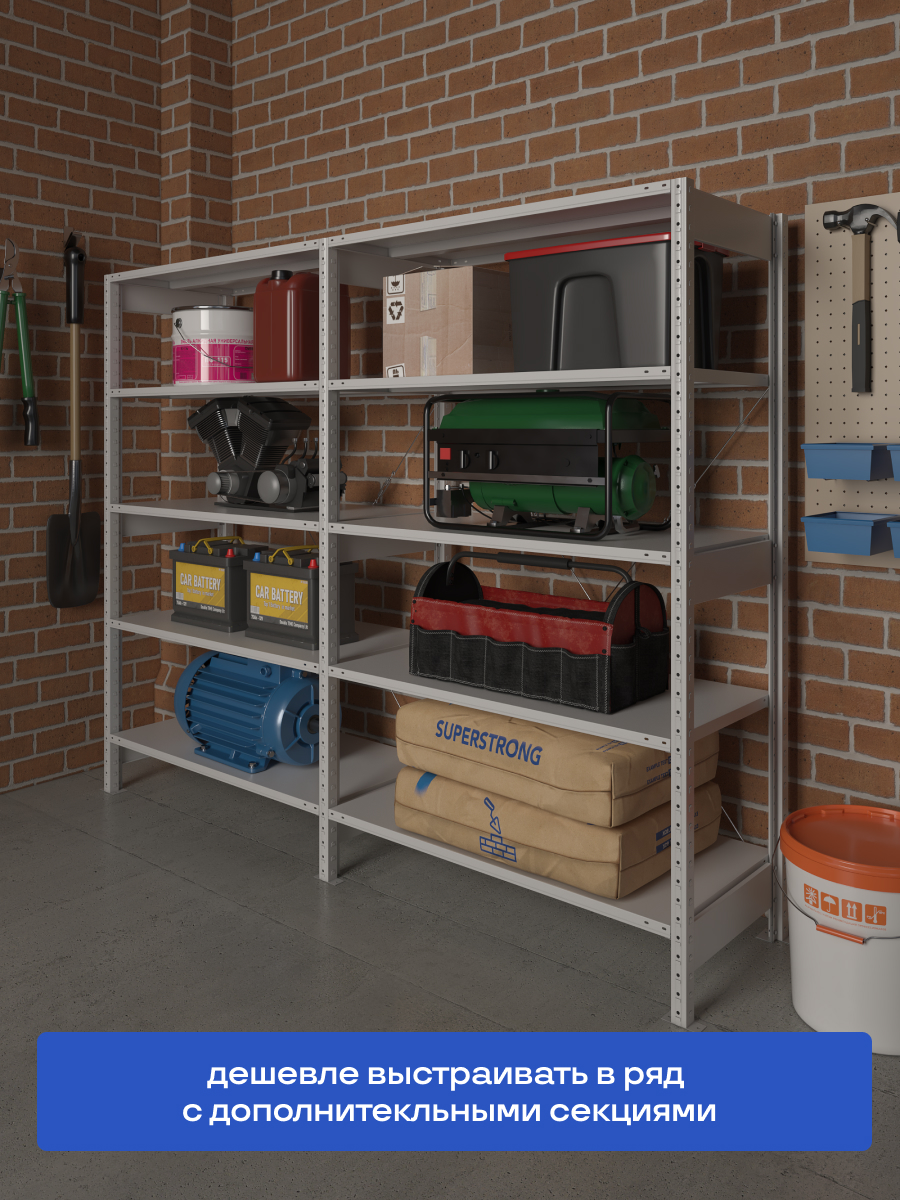 - Верстак МПК 6/1,6 860х1600х685 (2-тумбовый с шуфлядами) / Стеллаж на зацепах МПК (2000х700х500)/5, нагр.150кг (дополнительная секция без растяжки) / Стеллаж на зацепах МПК (2000х700х500)/4, нагр.150кг (основная секция)