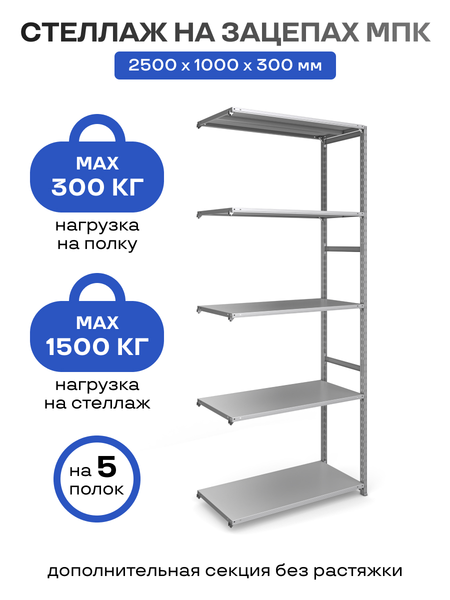 Стеллаж на зацепах МПК (2500х1000х300)/5, нагр.300кг (основная секция)