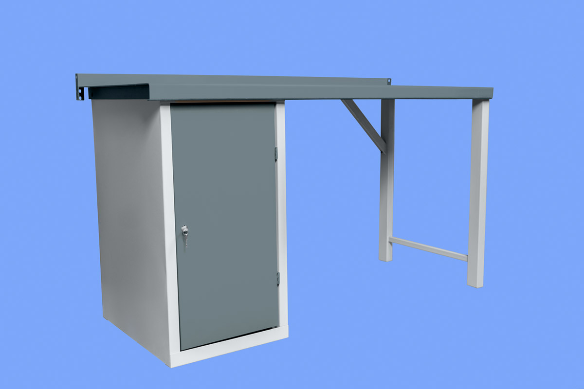 Распределенная нагрузка на столешницу до 900кг. Столешница верстака окрашена полиуритановой ударопрочной краской . Цвет корпуса: светло - серый (RAL 7035).